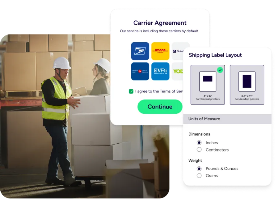 Use the Onboarding element to walk merchants through setting up warehouses, agreeing to terms, adding payment methods, and activating carrier accounts. This guided flow helps sellers complete everything required to start shipping labels quickly, while your team tracks completion and hands off smoothly into day-to-day usage.