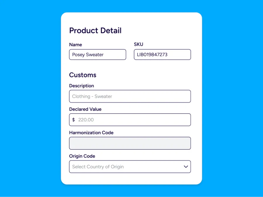 Declare each item in a shipment with the level of detail global customs authorities expect. The products object supports item descriptions, declared value and currency, weight and unit, SKU, harmonized tariff codes, country of origin, VAT rates, and more—helping speed classification and reduce the risk of delays or returns.