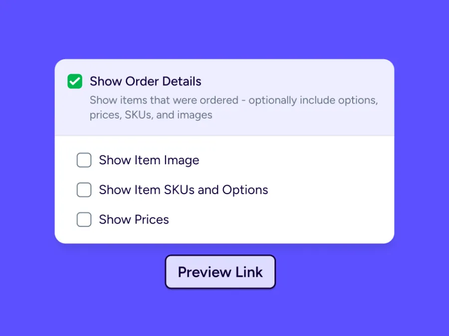 Choose exactly what appears on your branded tracking pages, packing slips, and emails. Show logos, product images, SKUs, and prices—or hide sensitive details for gifts and special orders—so every message stays on brand while giving customers clear delivery information.