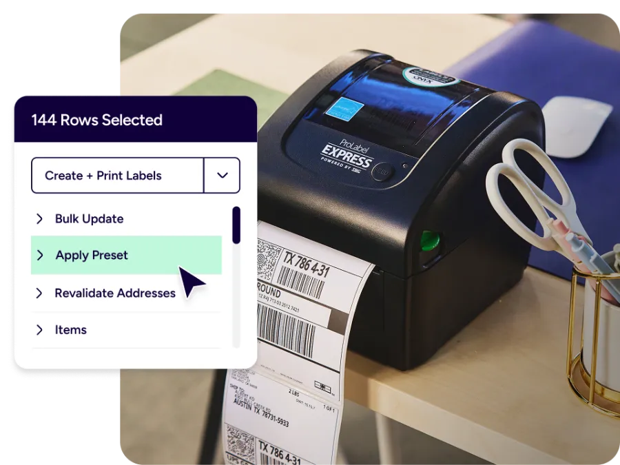 Print shipping labels from wherever you work. ShipStation supports standard desktop printers and thermal label printers, so you can work the way that best fits your packing stations. Create labels one at a time or in bulk, customize formats, and let intelligent automation keep your team moving efficiently—even during peak volume.